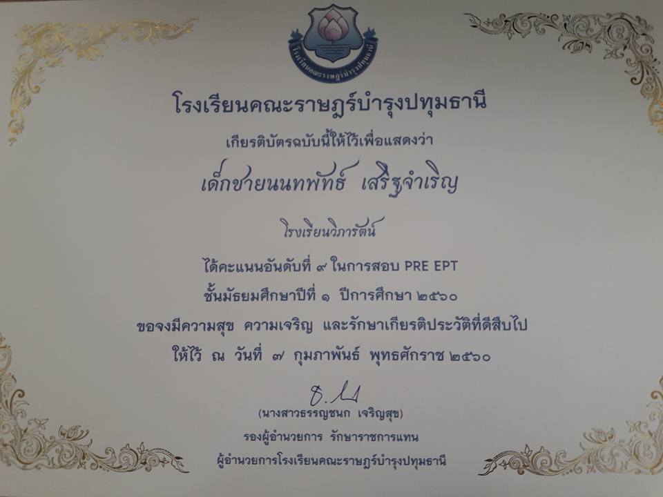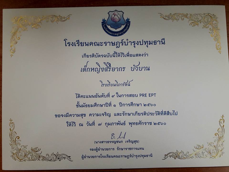 ขอแสดงความยินดีเด็กหญิงสิริยากร บัวบาน ชั้นประถมศึกษาปีที่ ๖๒ และเด็กชายนนทพันธ์ เสริฐจำเริญ ชั้นประถมศึกษาปีที่ ๖๑ สอบได้คะแนนอันดับที่ ๙ ในการสอบ PRE EPT ชั้นมัธยมศึกษาปีที่ ๑ ปีการศึกษา ๒๕๖๐