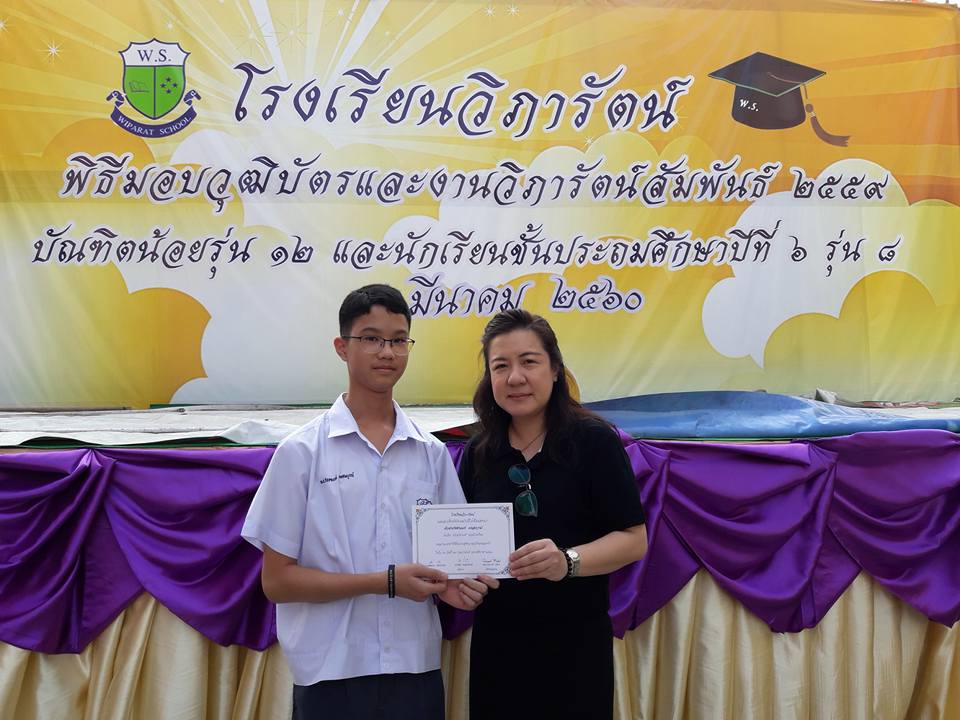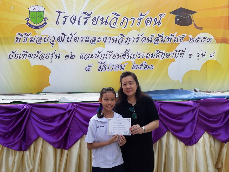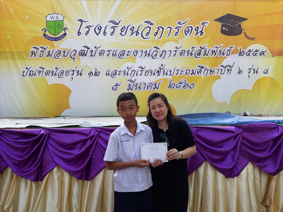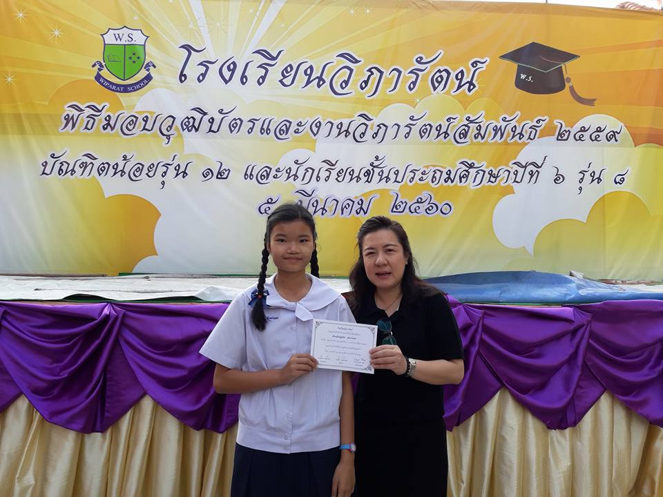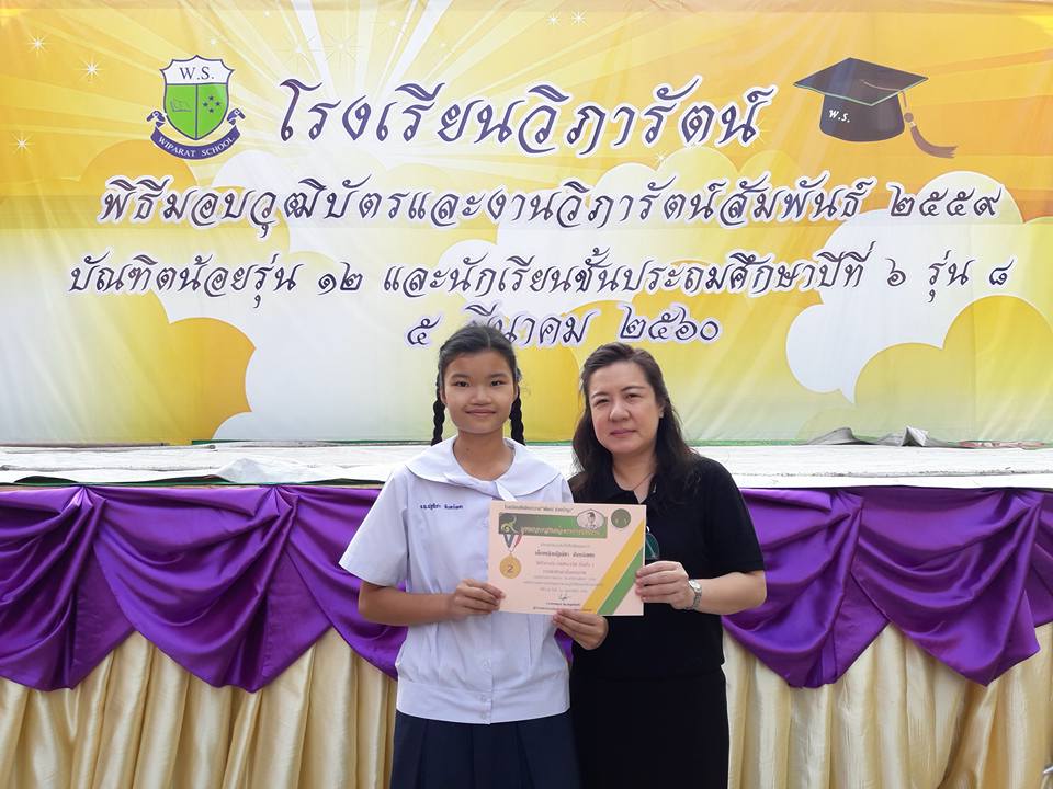 ผศ.ดร.วิภาวดี ทูปิยะ ผู้รับใบอนุญาติโรงเรียนวิภารัตน์ให้เกียรติมามอบเกียรติบัตรให้กับนักเรียนที่ได้รับรางวัลต่างดังนี้ รางวัลการแข่งขันตอบปัญหาภาษาอังกฤษด้วยระบบออนไลน์ได้รับรางวัลรองชนะเลิศอันดับ ๑ ชิงแชมป์ภาคการศึกษา จำนวน ๒ คนได้แก่ 1 ด.ช. นรภัทร ทูปิยะ 2.ด.ญ. พิมพกานต์ อมรโภคกุล รางวัลสอบ Pre EPT ลำดับที่ ๙ โรงเรียนคณะราษฎร์บำรุงปทุมธานี 1.ด.ญ.สิริยากร บัวบาน 2.ด.ช.นนทพัทธ์ เสริฐจำเริญ รางวัลสอบ Pre สวนกุหลาบวิทยาลัยนนทบุรี ครั้งที่ ๓ ประเภทสอบห้องเรียนทั่วไป ได้ลำดีบที่ ๒ คะแนน ๘๗.๕๐ % รางวัลดุริยางค์ของโรงเรียนระดับชั้นประถม ๖ 1.ด.ช.นรภัทร ทูปิยะ 2.ด.ช.อัยการ มีพรมณี 3.ด.ช.นนทพัทธ์ เสริฐจำเริญ 4.ด.ช.รัชชานนท์ คงสมบูรณ์ 5.ด.ช.อัครชัย ธรรมลังกา 6.ด.ช.ก้องภพ อัครรักษ์พงษ์ 7.ด.ช.เศรษฐพงศ์ สิทธิชัยเนตร 8.ด.ญ.สิริยากร บัวบาน 9.ด.ญ.รินทร์ชฎา พรมแย้ม 10.ด.ญ.กมลวรรณ พวงงาม 11.ด.ญ.นันทิกานต์ ส่งสุขเลิศสันติ 12.ด.ญ.ฐปนีย์ ศิริวาณิชย์ 13.ด.ญ.ณัฐวลัญช์ ตระกูลประดิษฐ์ 14.ด.ญ.ปภาวรินทร์ ผิวขม 15.ด.ช.คณนาถ สิญฐ์เจริญ รางวัลกรรมการนักเรียน ๒๕๕๙ 1.ด.ญ. พิมพกานต์ อมรโภคกุล ประธานนักเรียน 2.ด.ญ.ศุภกร นราสภา รองประธานนักเรียน 3.ด.ช.เศรษฐพงศ์ สิทธิชัยเนตร รองประธานนักเรียน 4.ด.ญ.สวรส ชมนัด เลขานุการ 5.ด.ญ.ชญารัศม์ ชนะโชติ เลขานุการ 6.ด.ญ.ณัฐณิชา จันทร์เพชร กรรมการ 7.ด.ช.นรภัทร ทูปิยะ กรรมการ 8.ด.ช.กิตติภณ เงินรี กรรมการ รางวัลนิทรรศการวิชาการ " ๙ บูรณาการสานต่อพระราชปณิธาน" กิจกรรมสะกดคำ ครูผู้ฝึกสอน น.ส.ประภัสสร อริยเมตตา 1.ด.ญ.สิริยากร บัวบาน ชนะเลิศอันดับ ๑ 2.ด.ญ.ชนิกานต์ ศิริรัตน์ ชนะเลิศอันดับ ๑ กิจกรรม Spelling Bee ครูผู้ฝึกสอน นางขนิษฐา นนทนาคร 1.ด.ช.นรภัทร ทูปิยะ ชนะเลิศอันดับ ๑ 2.ด.ช.นนทพัทธ์ เสริฐจำเริญ ชนะเลิศอันดับ ๑ 3.ด.ญ. พิมพกานต์ อมรโภคกุล รองชนะเลิศอันดับ ๑ กิจกรรมเล่าเรื่องจากภาพ ผู้สอน ครูวิลัย ทองมอญ 1.ดญ.ณัฐณิชา จันทร์เพชร รางวัลชนะเลิศการแข่งขันเครื่องบินพลังงานยาง ประเภทบินไกล 1.ด.ช.พิชาภพ ฝางคำ 2.ด.ช.กิตติกานต์ วันเสน |